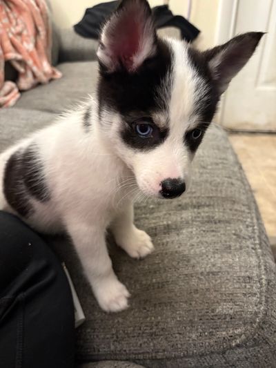 Snowflake, a third-generation Pomsky, is a compact and spirited dog. She will be bred to another Pomsky.